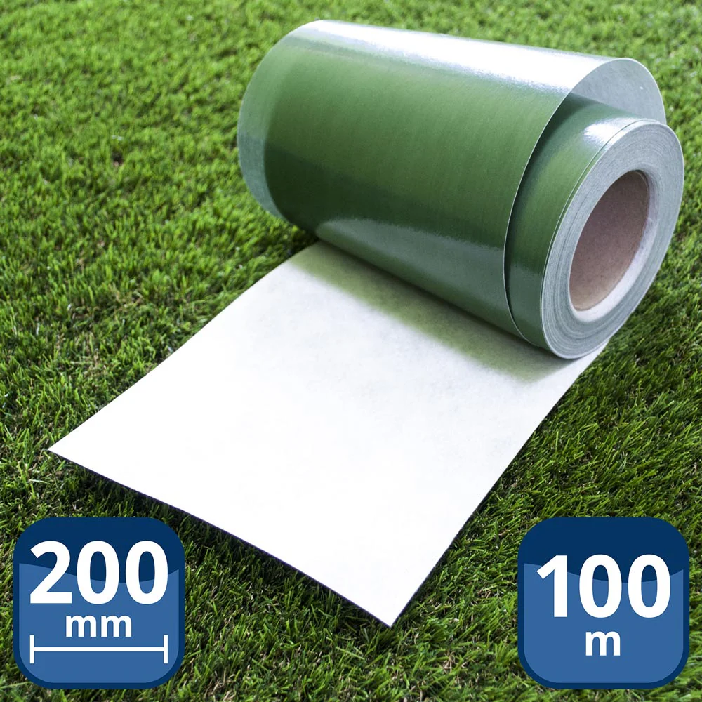 The tape is not self adhesive and is made up of a strong geo-textile fabric which is laminated onto a film, when this is used with one of our EnviroStik Adhesive sets this will form a strong bond to secure your Outdoor Carpet or Artificial Grasses together. This seaming tape is designed to be laid green side down and the adhesive should be applied to the white side.